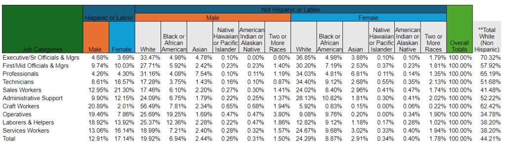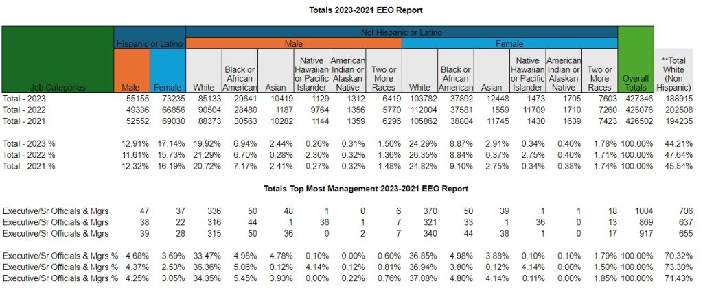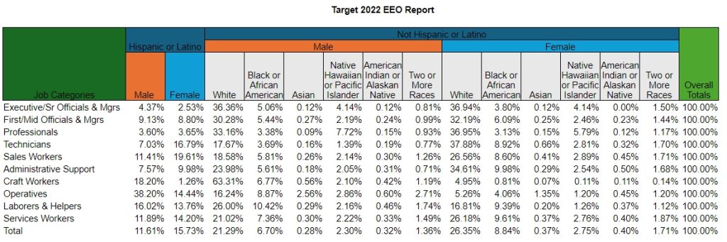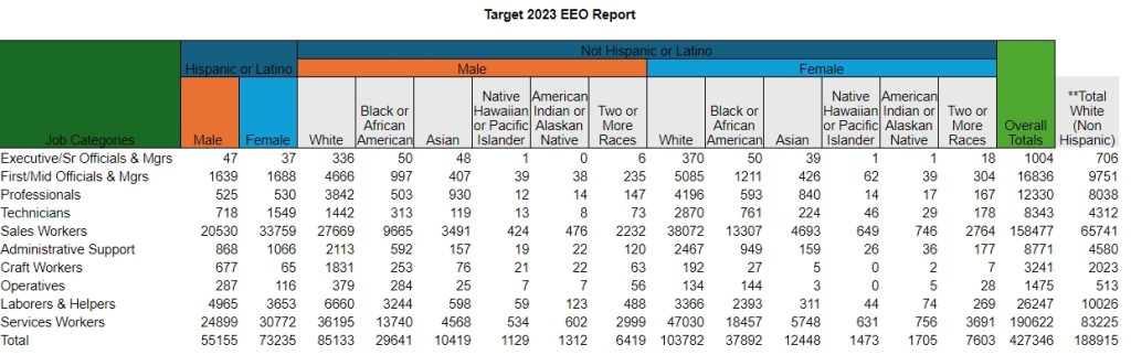 Below is a series of Excel Spreadsheets I created from data in the Target EEO Reports for 2023, 2022, and 2021 in descending order. The original report data to include spreadsheets are available at the links listed in the Reference section below. The original data does not include percentages or total white (non-Hispanic) column as I added total calculations in my version of the spreadsheets.