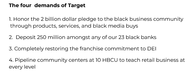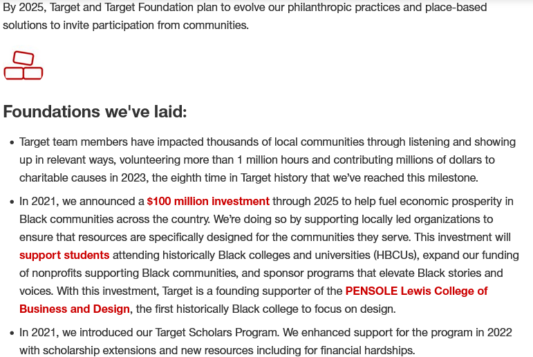 On April 7, 2021, Target announced its commitment to spend $2 billion dollars with Black owned businesses by the end of 2025. Update Part 1 Update Part 2 — Problem is Target has no record on its website of what it has paid out to Black Businesses in dollar terms that I could find as of March 2, 2025. That is something they should have included in their January 25, 2025 announcement on DEI and other matters.