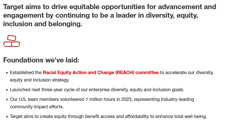 On January 24, 2025 Target announced that in 2025 it is concluding that initiative. However, the wording in the announcement is rather non-specific and lacks clarity being open to multiple self-serving interpretations.