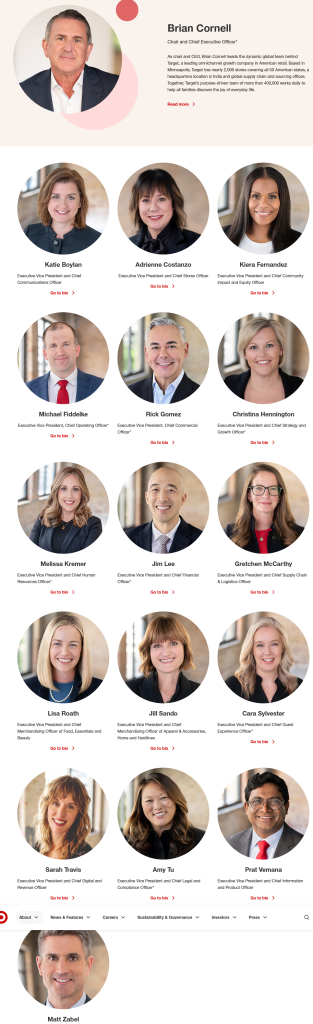 So after all the DEI initiatives from 2020 to2024 as of March 2, 2025 Target Top Leadership Demographics consisting of a One (1) Chair/CEO and sixteen (16) Executive Vice Presidents for a total of 17people are as given above and below. Notice there are Zero (0) Black Americans: