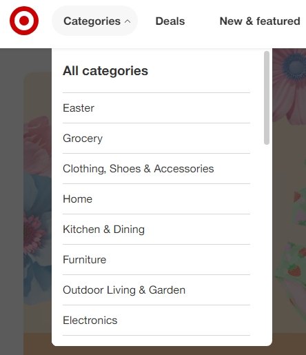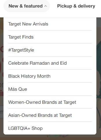 Below is pictures of target website menu dropdown items as of March 1, 2025. It shows Target provides areas on its website designed to take the user to products offered for Christian and non-Christian Holidays as well as by businesses in the certain identified EEO/DEI categories. This include recognizing special time periods set aside in society for certain categories. The first picture is the Categories menu dropdown. The second is the New and Featured menu dropdown.