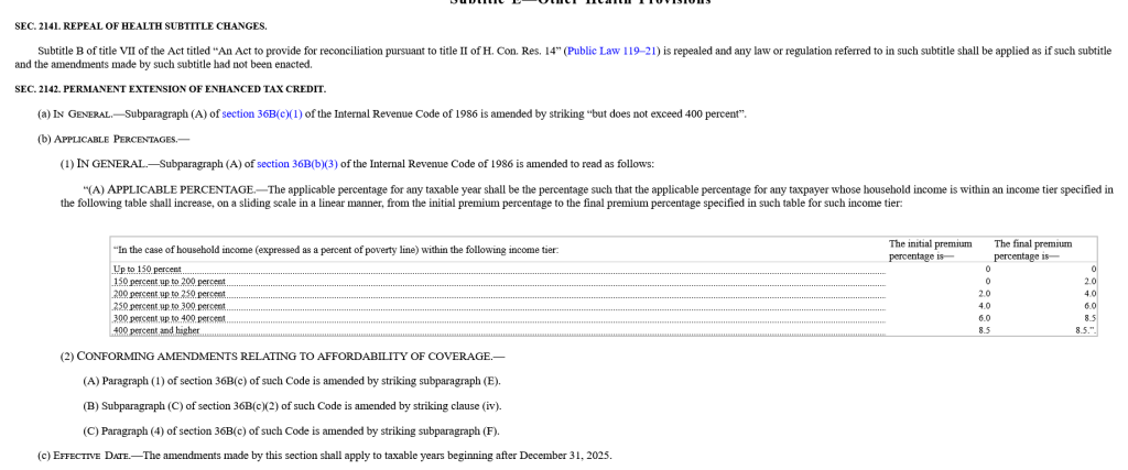 Apparently due to procedural rules Democrats were able to insert the below premium tax credit language into the Senate S2882 Continuing Appropriation version of HR 5371. Whether or not the Premium Tax Credits should be extended permanently I don’t know as I have not studied it carefully. I do know it should not be a reason to shut the government down to the point where people are not given SNAP.